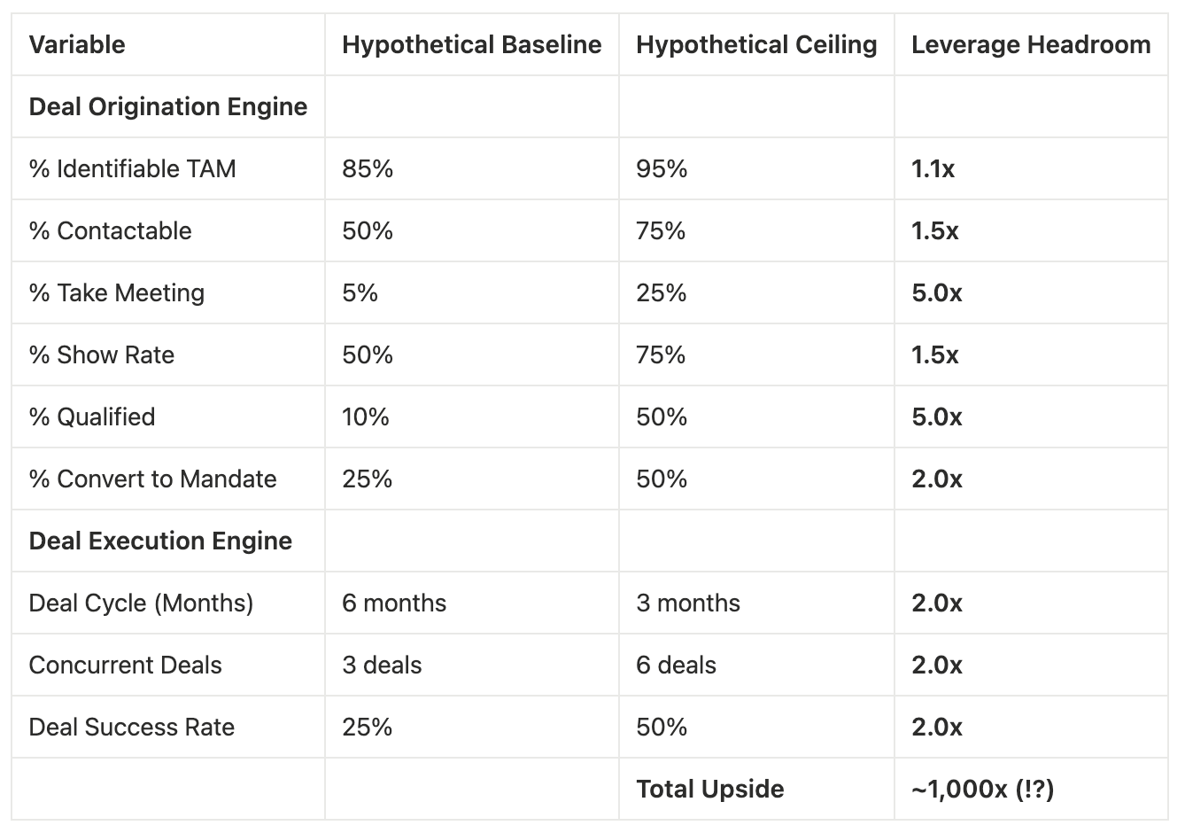 This is all possible before traditional scaling. All of this leverage is unlocked without hiring a single extra banker or chasing bigger deals. These variables improve the engine itself.